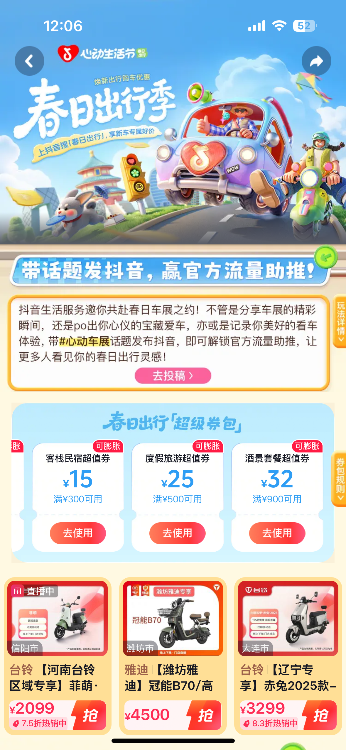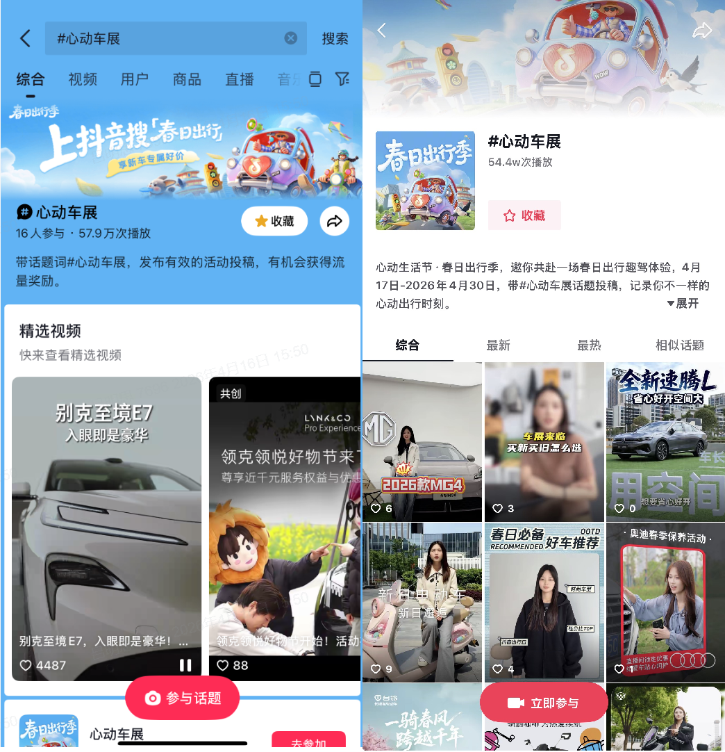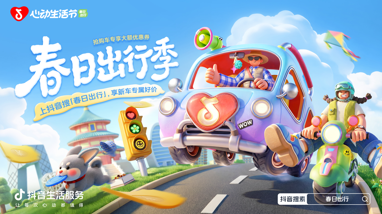 为了让这次春日出行季触达每一个有需要的人,抖音生活服务也拿出了超顶的资源矩阵。活动超级会场、官方话题、热点话题、抖音开屏等多个重点资源点位同步上线,精准触达购车兴趣人群、春日出行爱好者,持续为活动引流蓄水。你每天第一次打开抖音,可能就会看到心仪的车型向你驶来;搜索“心动生活节”,进入主会场,所有品牌、所有优惠、所有达人内容一页聚合,一目了然。从“看到”到“出发”,抖音为你架起最直接的桥梁。