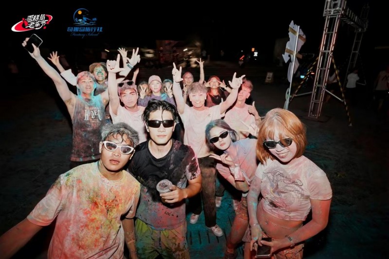 B面是傍晚的夏日狂欢。七彩泡泡从机器中喷涌而出,水枪的水花四处喷洒,电子节拍震动着脚下的地面。刚才还在安静欣赏老车的人们,此刻正在泡泡与水花中尽情舞动。一位从成都来的游客说:“这种反差太有意思了,白天穿越回60年代,晚上回到21世纪的派对,一张票体验两种人生。”