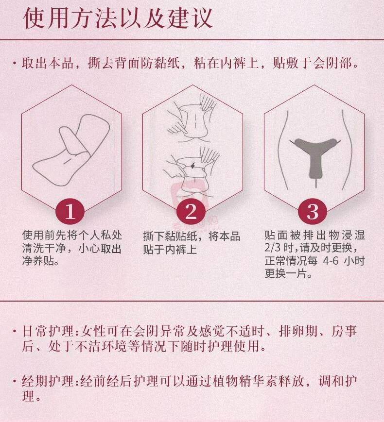 规格:12片/盒禁忌:孕妇禁用温馨提示:孕妇禁用;本品为一次性卫生用品,禁止重复使用。使用方法:初期一天2-3片、贴于内裤上,4到6小时更换一次。打湿面积超过1/4请及时更换!经期停用,月经干净两三天后可以用。